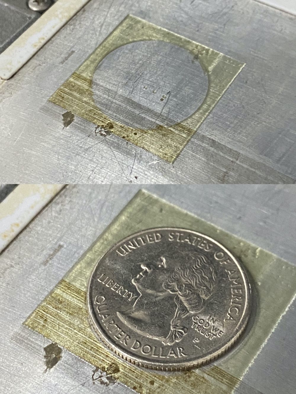 To save space, a trace was printed under the top layer, so this is technically a three-layer board (two signals on top of a 25-cent 'ground-layer'). A key consideration was aligning the coin to the machine, which was resolved by creating an outline with a single, very large via in the middle that would force the SV2 to print a quarter-sized circle for indexing and alignment purposes. Excuse the dirty surface - we print A LOT at BotFactory.