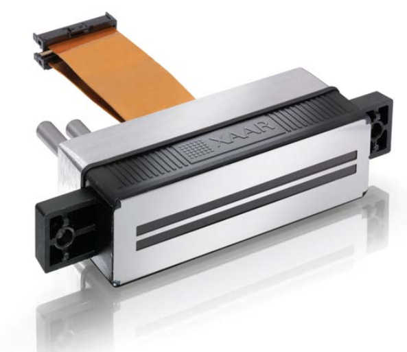 Fig: An industrial inkjet printhead. The Xaar 1003 has 1000 active nozzles in 2 rows (7).